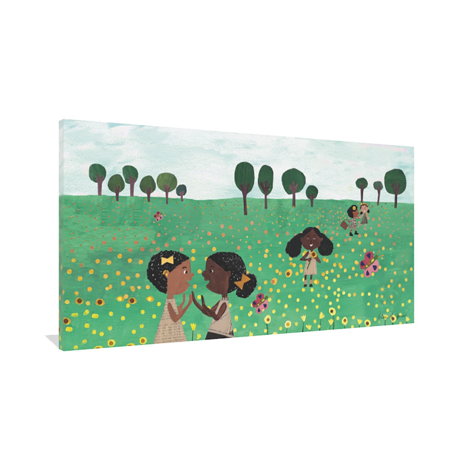 Feel the joyful energy and carefree spirit of childhood in any room with this vibrant canvas print featuring little Black girls playing in a field where flowers are blooming all around them. Full of movement, joy and unrestrained laughter, this piece celebrates the beauty of play and the natural wonder of growth - both personal and in nature.