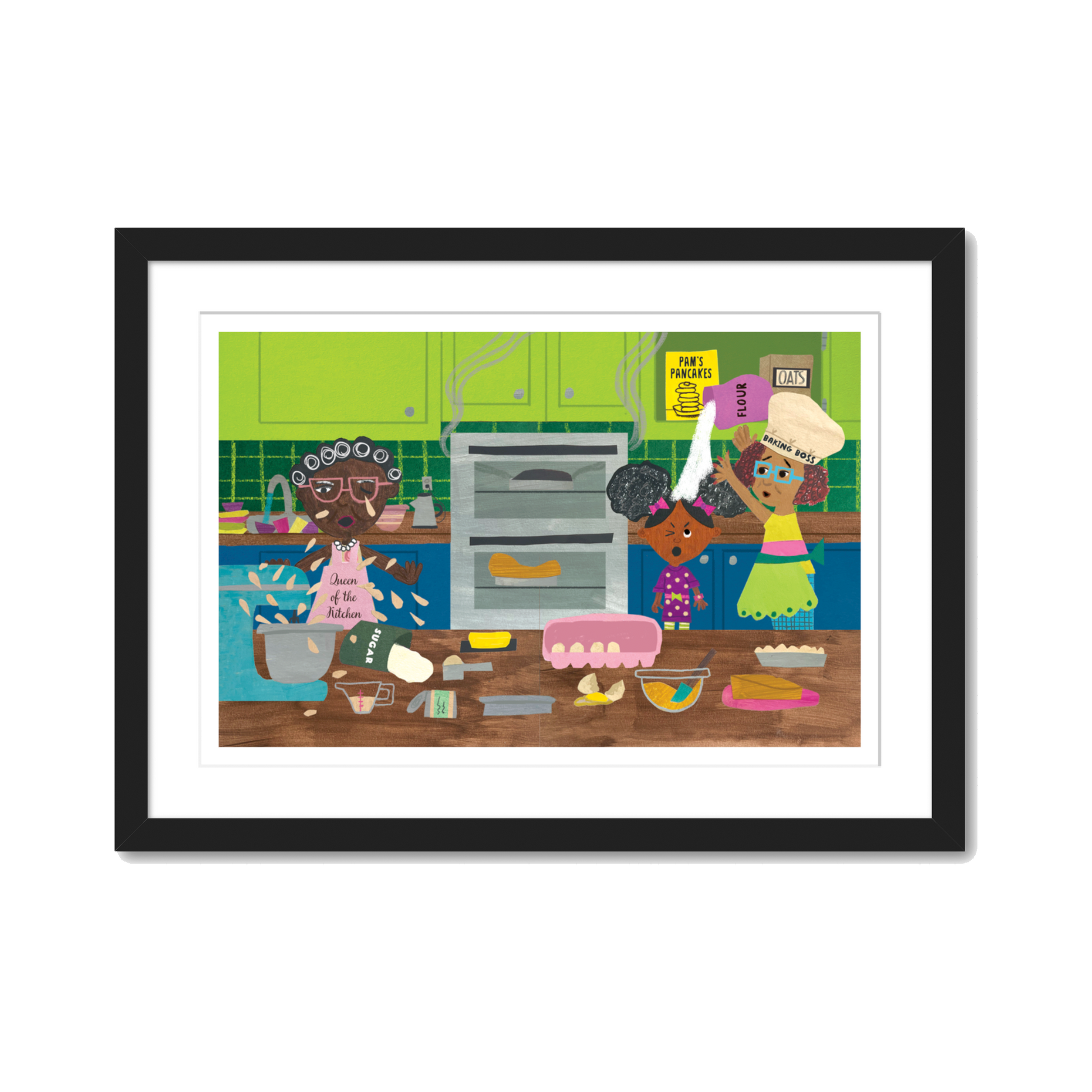 This print features art from Zara in the Middle (HarperCollins '25). The book written and illustrated by Erika Lynne Jones is a multi-generational story about finding your voice and the strength of family. In this scene Zara, who loves living next door to her Grandma Jane and Granny Gladys, is dealing with a bit of kitchen chaos as they prepare for her birthday party.